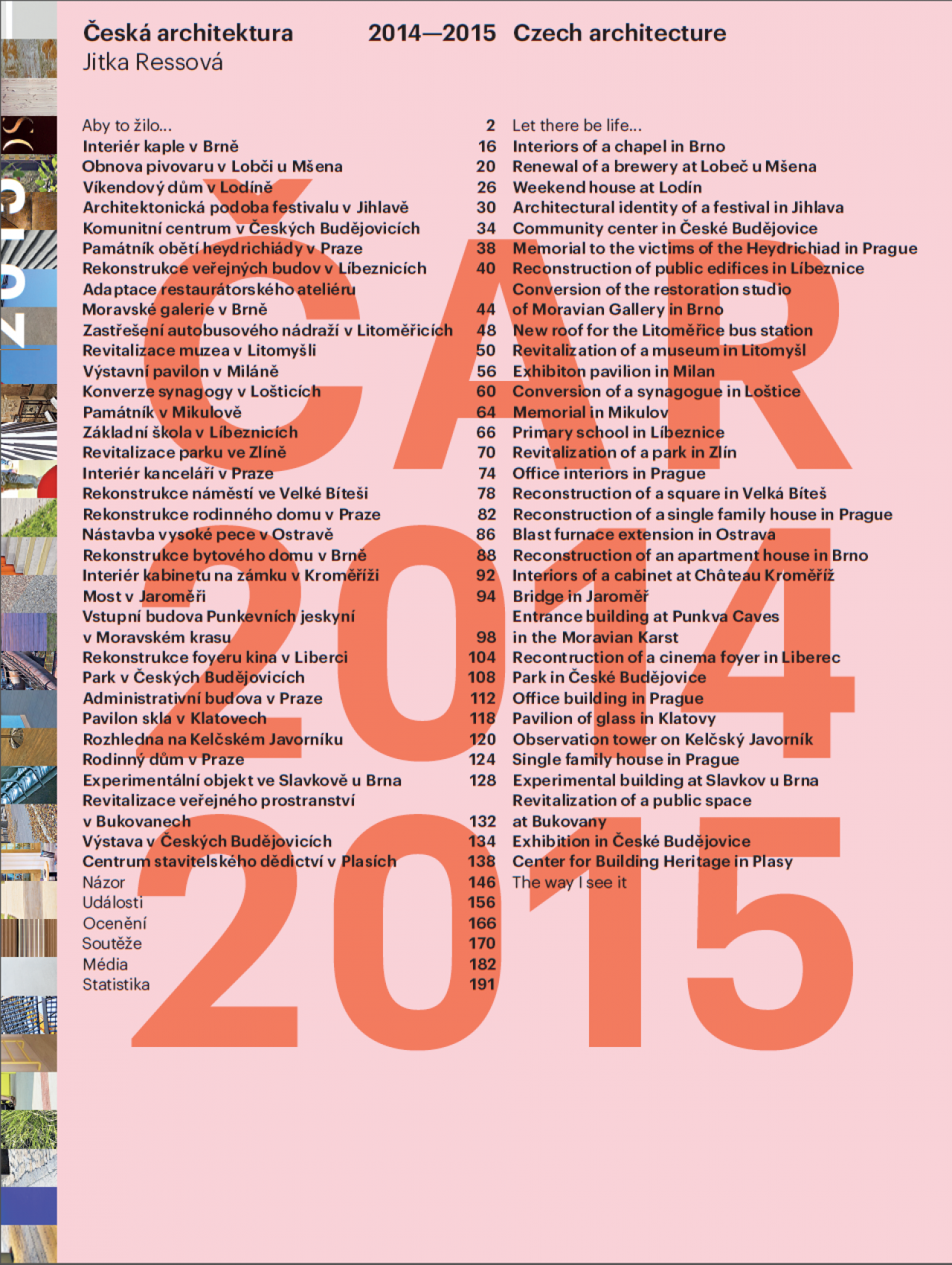 Pro zájemce ze zahraničí pak ročenka slouží jako stručný přehled soudobé české architektonické scény. Výběr staveb provádí vždy jedna osobnost z prací nabídnutých vyzvanými architekty. Kniha se skládá ze tří kapitol. Hlavní z nich Stavby prezentuje 33 typologicky rozmanitých objektů s komentáři a úvodním rozhovorem editorky s Karolinou Jirkalovou. V kapitole Názor hovoří Petr Volf se Stanislavem Martincem a Ondřejem Chybíkem o českém pavilonu na Expo 2015 v Miláně. Třetí kapitola Faktografie přináší přehled událostí v oboru, ocenění vybraných osobností za celoživotní dílo, statistické přehledy a výsledky vybraných celostátních soutěží a soutěží spolupořádaných Českou komorou architektů. Kapitolu uzavírá seznam vydané a doporučené literatury a odborně zaměřených filmů.