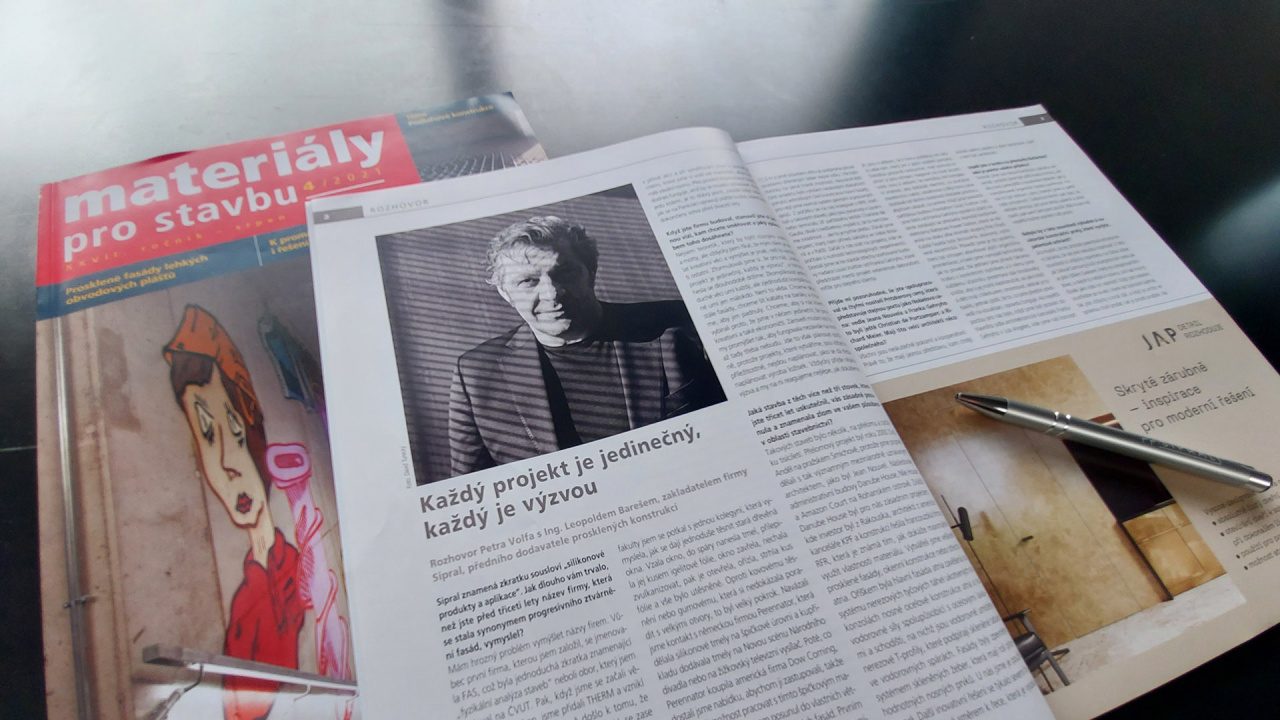 In the 4/2021 issue of the magazine Materiály pro stavbu (Materials for Construction), you will find Petr Volf´s interview with Leopold Bareš, founder and owner of Sipral. You can read about the company’s beginnings and the projects that marked a turning point for the Sipral brand, propelling it to an industry-leading position in the field of glass facades in the Czech Republic and abroad.